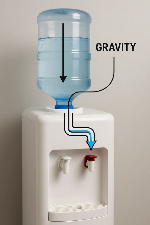 Dispensadores de agua de carga superior Coloque la botella de agua boca abajo en la parte superior de la unidad. La gravedad dirige el agua al depósito donde se enfría o calienta antes de dispensarla. Este diseño es una de las formas más antiguas y ampliamente adoptadas.